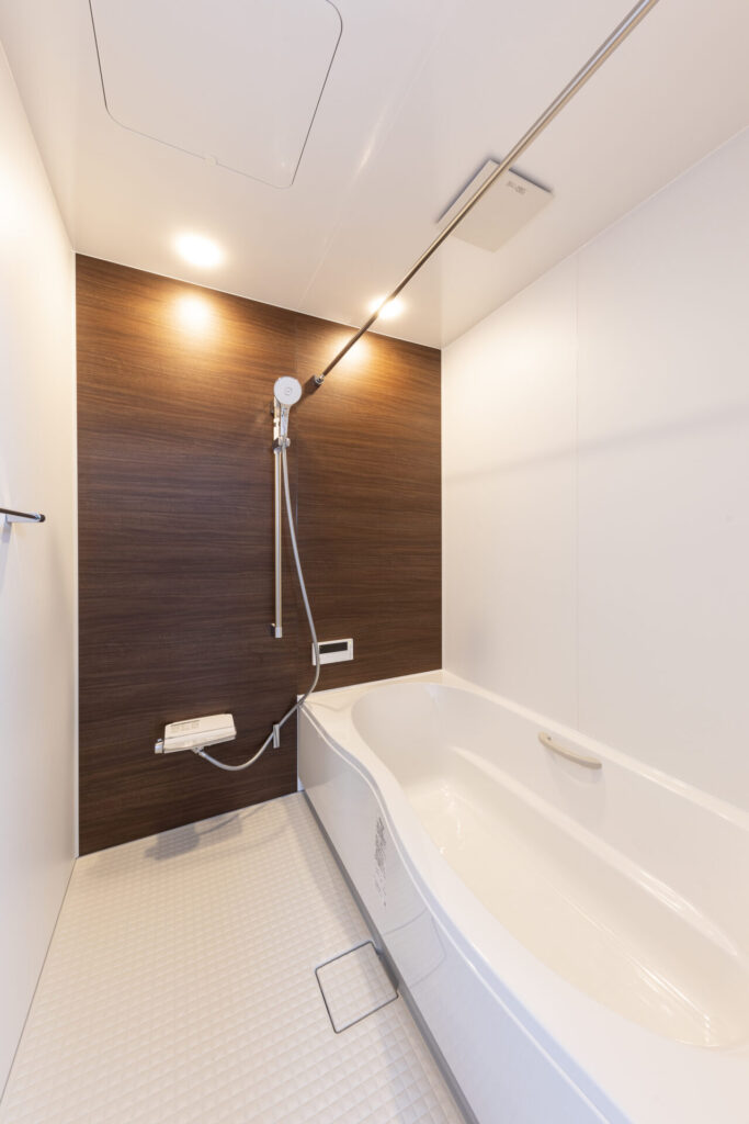 「掃除しやすい造りに」とのKさまのご要望で、浴室の壁には鏡やカウンター、棚をあえて設けずシンプル仕様に。
