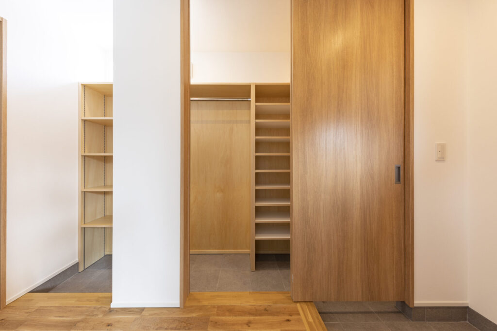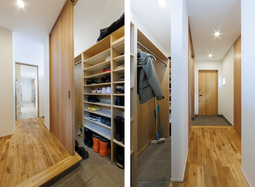 玄関には、土間収納、大容量のシューズクローゼット、コート掛け、可動棚を設け、たっぷりの収納スペースを確保しました。
