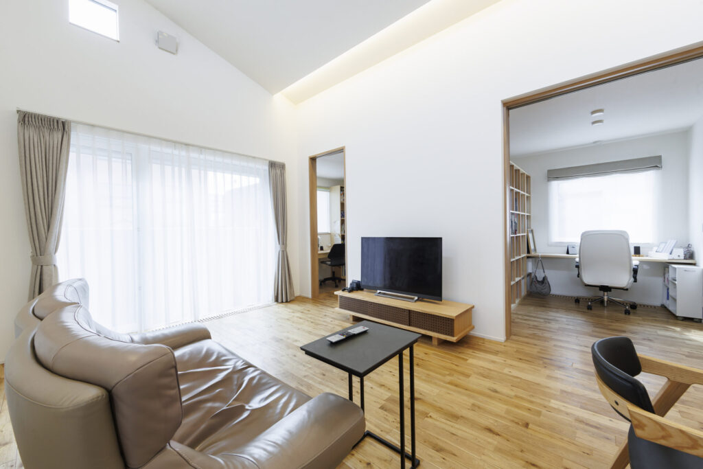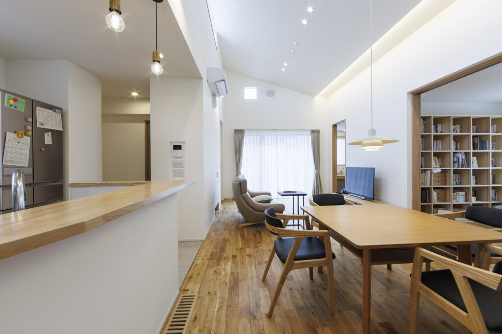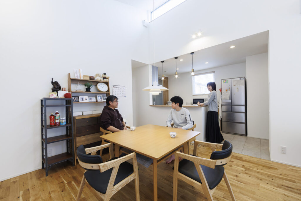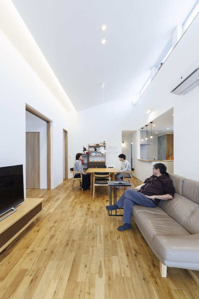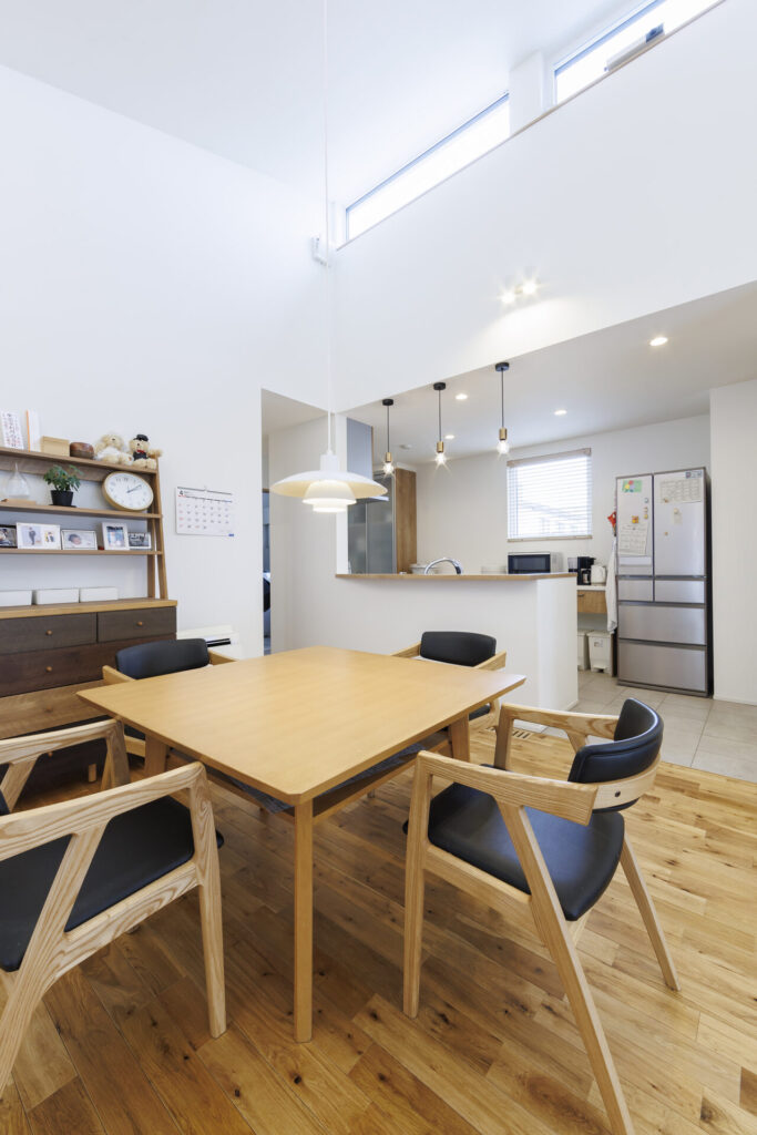 Kさま邸は、片流れ屋根の形状を利用した吹き上げと高窓(ハイサイドライト)からの採光で実際の面積以上に広さを感じられる平屋の住まい。リビングダイニングを中心に個室がつながる間取りになっており、家族との距離を近くに感じられるのも魅力です。