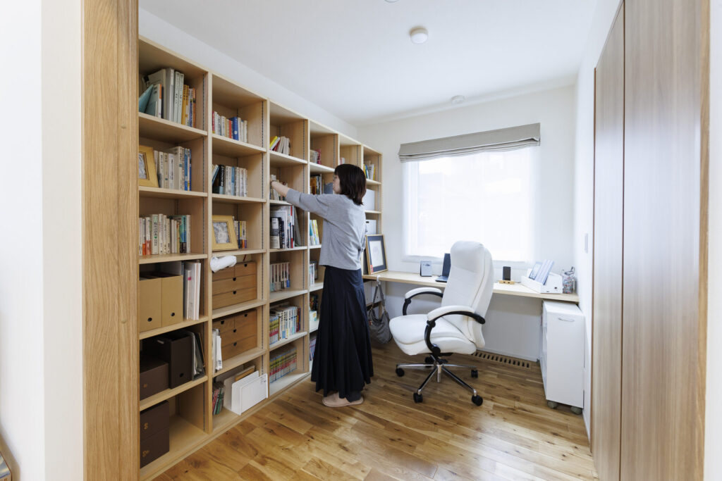 「本が多いので、備え付けの本棚を」という奥さまの要望で設けたのが書斎です。壁一面の本棚と、窓に面したカウンターは造作してもらいました。書斎は西側に位置しており、窓からの日差しをLDKに届けるため、出入り口は引き戸にして開け放って使うことが多いそう。
