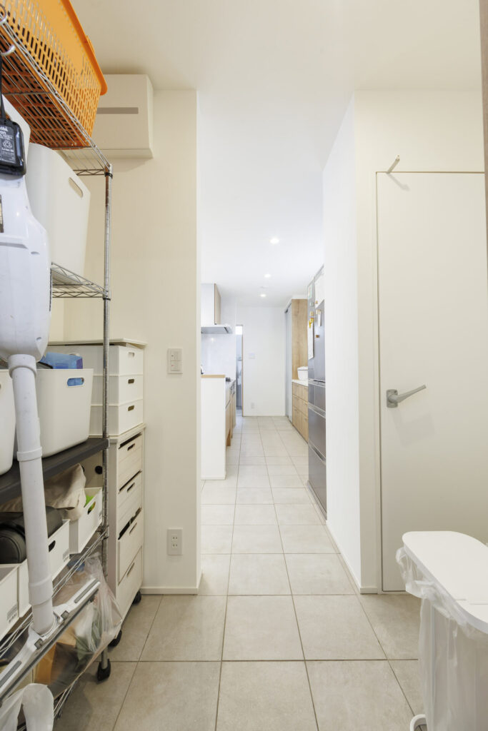 玄関ホールを入ったまっすぐ先はパントリーになっており、キッチン、洗面脱衣室へと一直線につながっています。