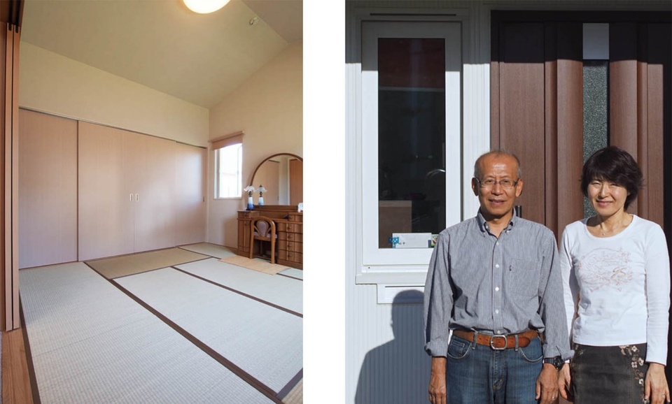 これは予算内でTさんが要望した間取りを実現すると同時に、道路からリビングへの視線を避ける目的もあります。この提案には「設計事務所のデザイン性が活きたなぁ」とTさん夫婦も感心しきり。また、和室の入り口は完全バリアフリー。引き戸を収納するとリビングと一体化して使えます。