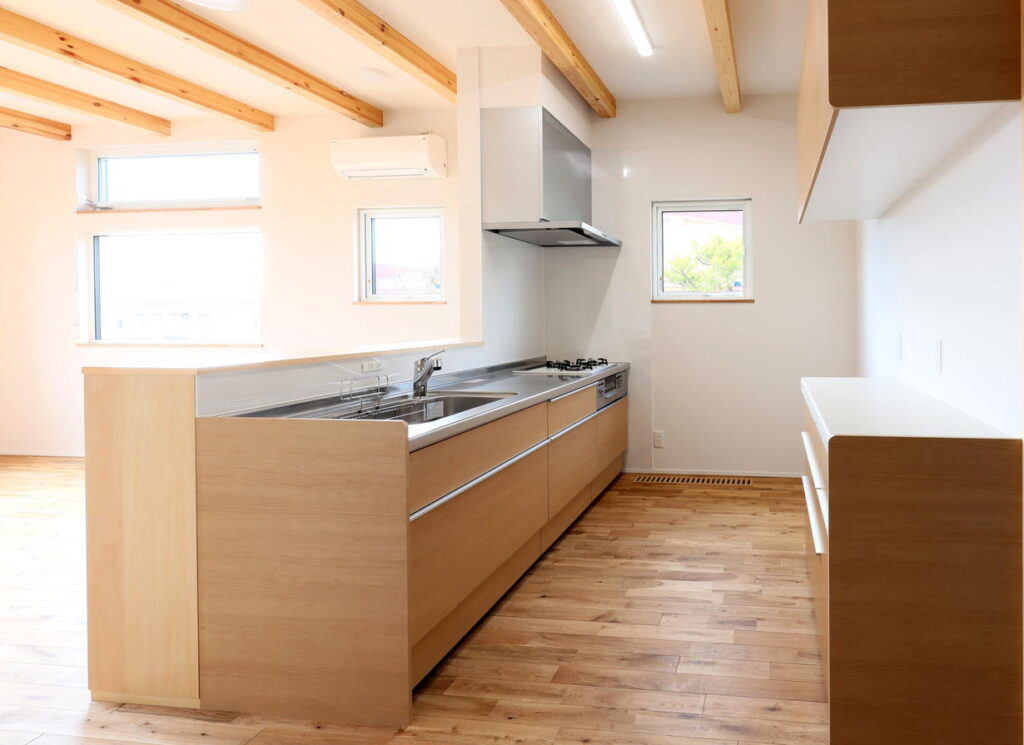 通路幅にゆとりを持たせて2人でも作業しやすいキッチン。冷蔵庫のほか冷凍庫を置けるスペースも確保しています。