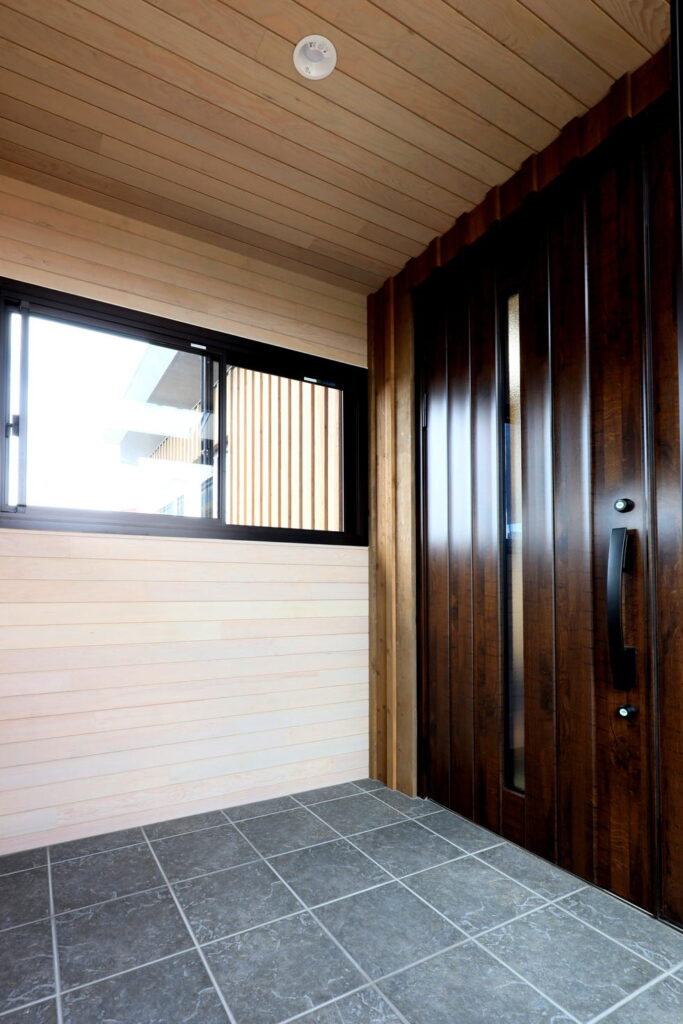 玄関は前面道路から見えないよう、風除室を設けてプライバシーに配慮。壁と天井を羽目板張りにしてくつろぎ感を演出しました。