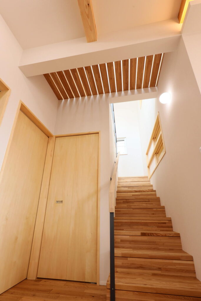 2階の階段室に設置した大きな窓からの光が、スノコ状の床を介して階下の1階を明るく照らす設計に。窓を開けると、心地よい風が家じゅうを巡ります。