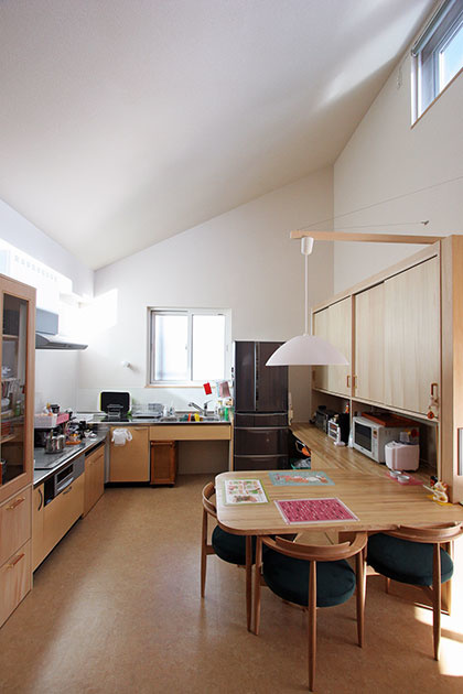 キッチンは(株)樋口(本社札幌市)の車いすでも使いやすいユニバーサルキッチンをL字型にアレンジしました。また、ダイニングテーブルをはじめとする家具類は、ソファなども含めNさまが使いやすいようオーダーしています。