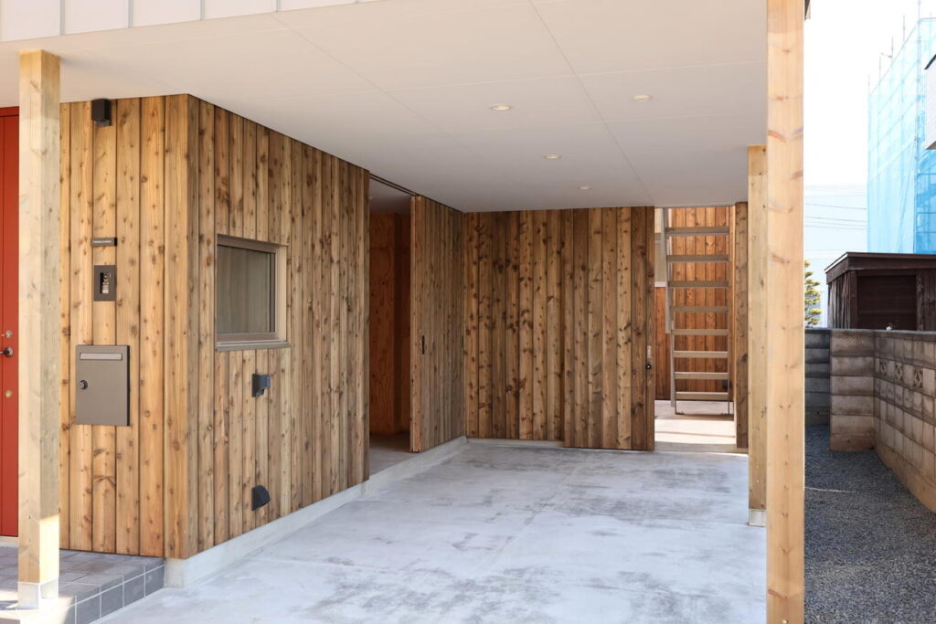 カーポートの壁はカラマツの羽目板張りでナチュラルな雰囲気に。物置が組み込まれており、天気が悪い日でも荷物の出し入れがしやすく便利です。