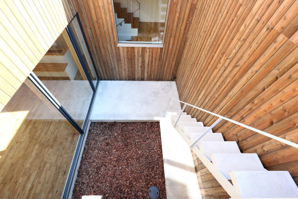 屋外空間が一体で設計されている点もYさま邸ならではの設計です。1階リビングを出て屋外のコンクリート敷きテラス・中庭が続き、さらに外階段が2階へと続きます。