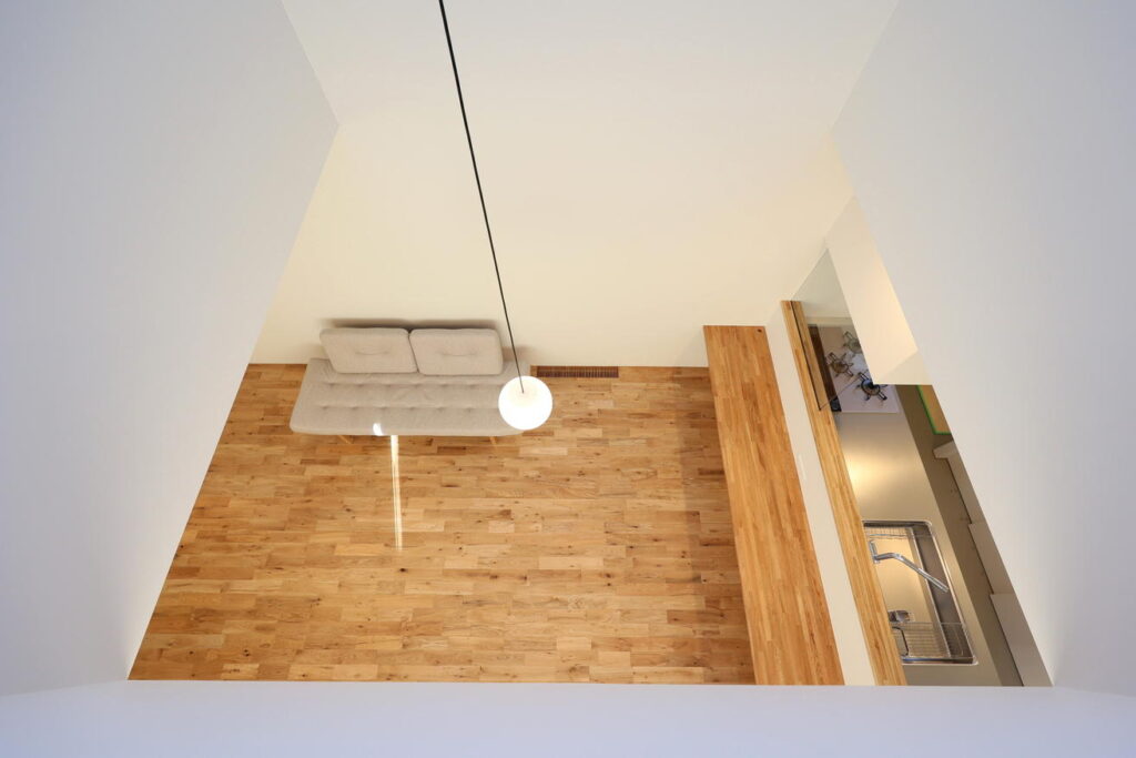 仲よし家族のYさまご一家にとって、どこにいてもお互いの存在が感じられることが家づくりの大事なポイントでした。LDK上部には吹き抜けがあり、上階・下階のどちらにいても家族の気配が感じられます。