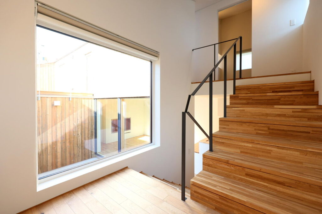 大きな窓からの自然光で明るい階段ホール。ここからも中庭を眺めることができます。