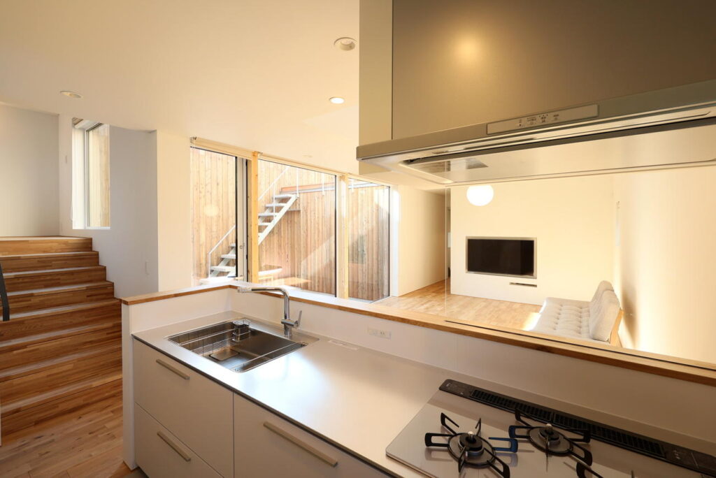 キッチンからはリビングダイニングと2階に続く階段が見渡せます。家族との時間を共有することができ、階段を行き来するお子さまの様子も分かって安心です。