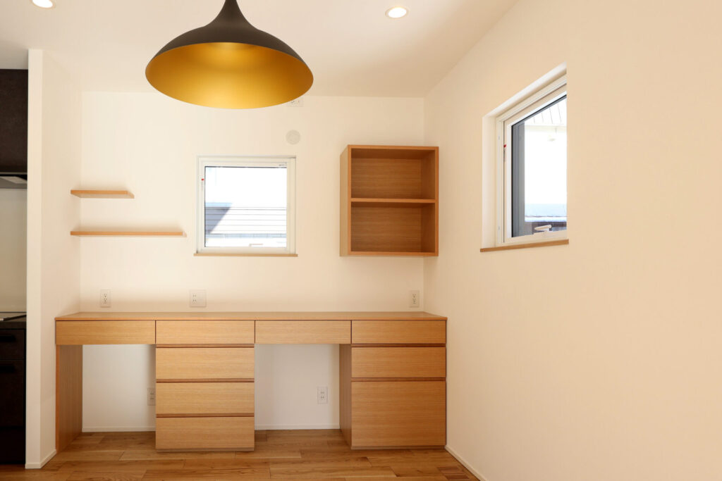 ダイニングテーブル背面の造作棚は、リビングで勉強をする息子さんの勉強道具をしまうために造作しました。