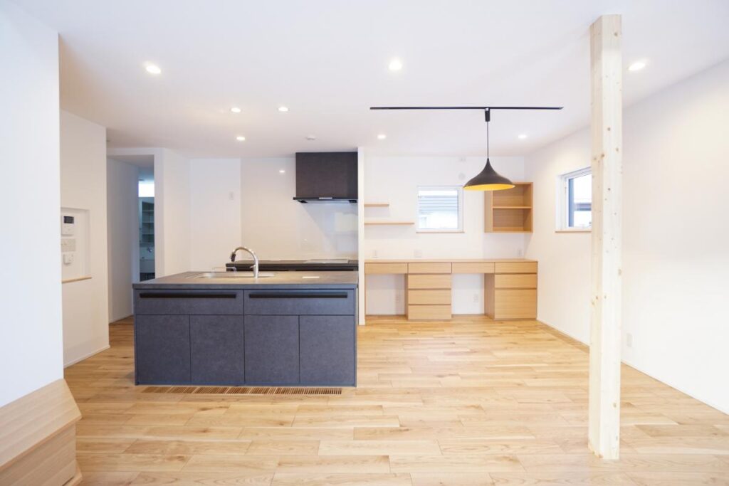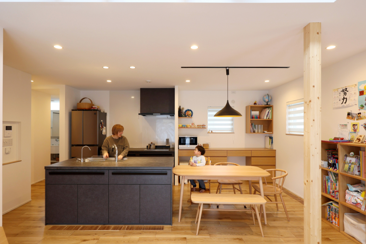リビングダイニングはホワイトとナラの木目を基調にしたナチュラルな雰囲気に。ダークカラーのキッチンやペンダント照明がアクセントになり、おしゃれな空間を演出しています。