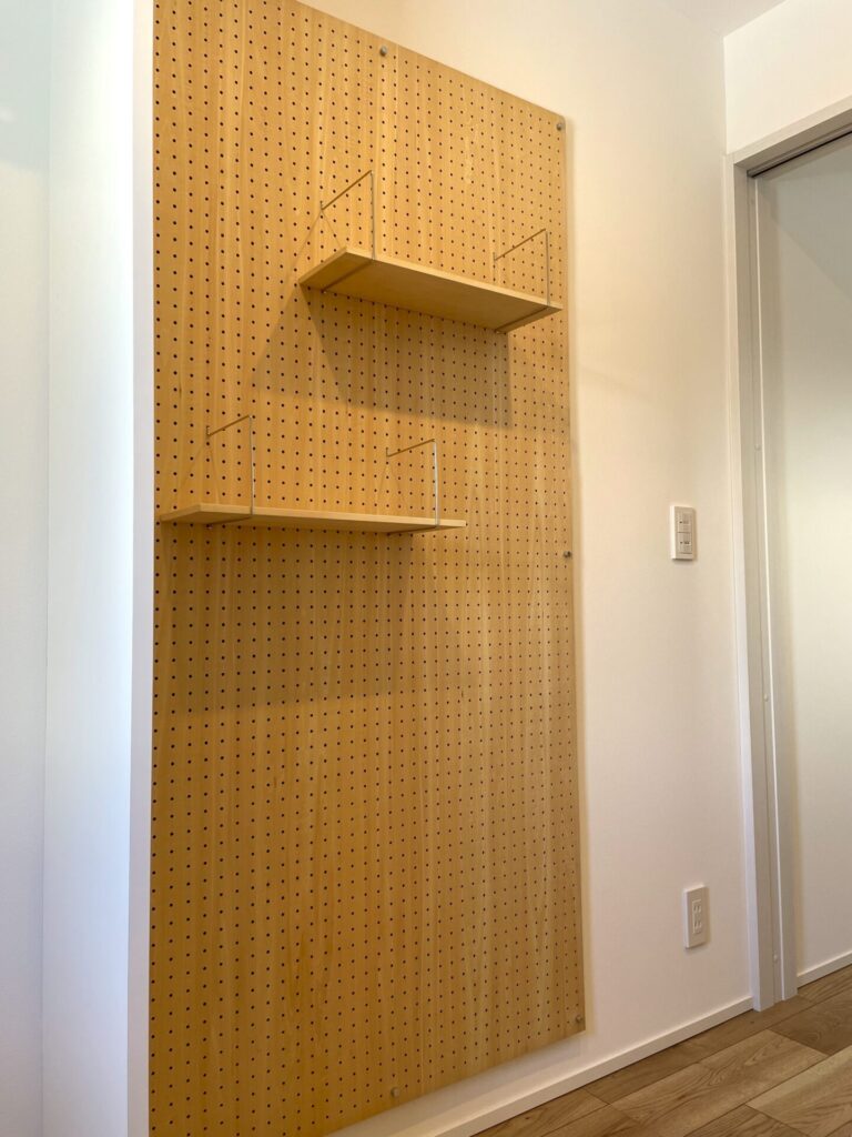 向かいの壁には有孔ボードを設置し、小物類などの収納スペースを確保しました。