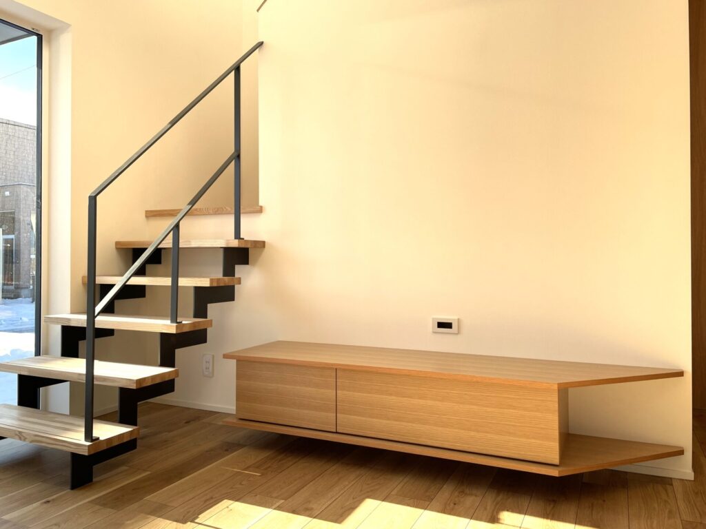 テレビボードはリビングの雰囲気に合わせ、木目調で造作しています。