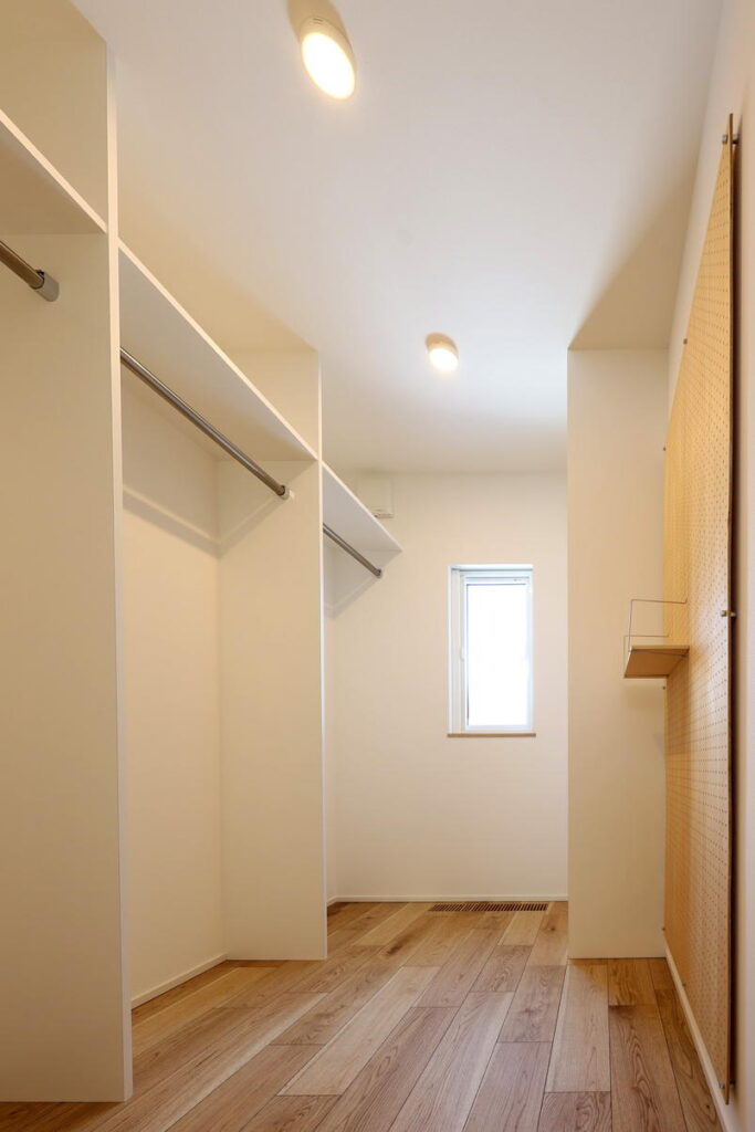 洗面化粧台から向かって右手奥の引き戸の先には、家族4人分の衣類が収納できるファミリークローゼットがあります。