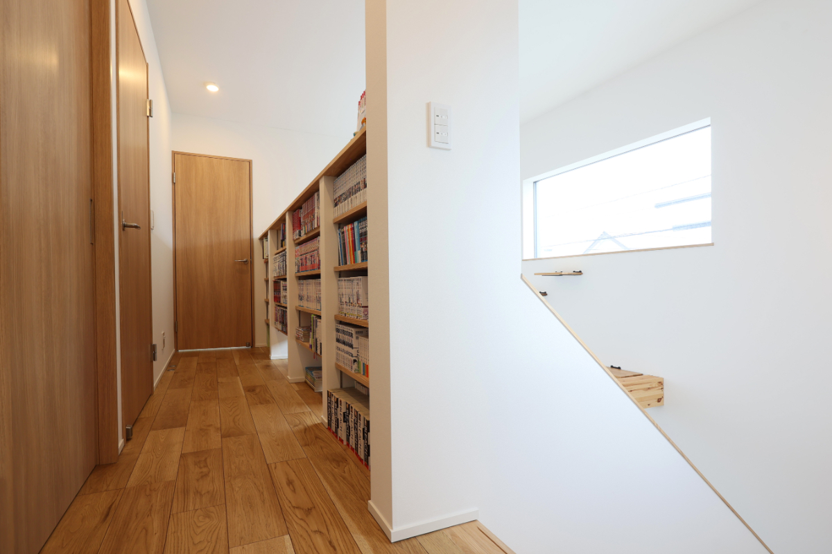 2階ホールの腰壁には本棚を造作しています。