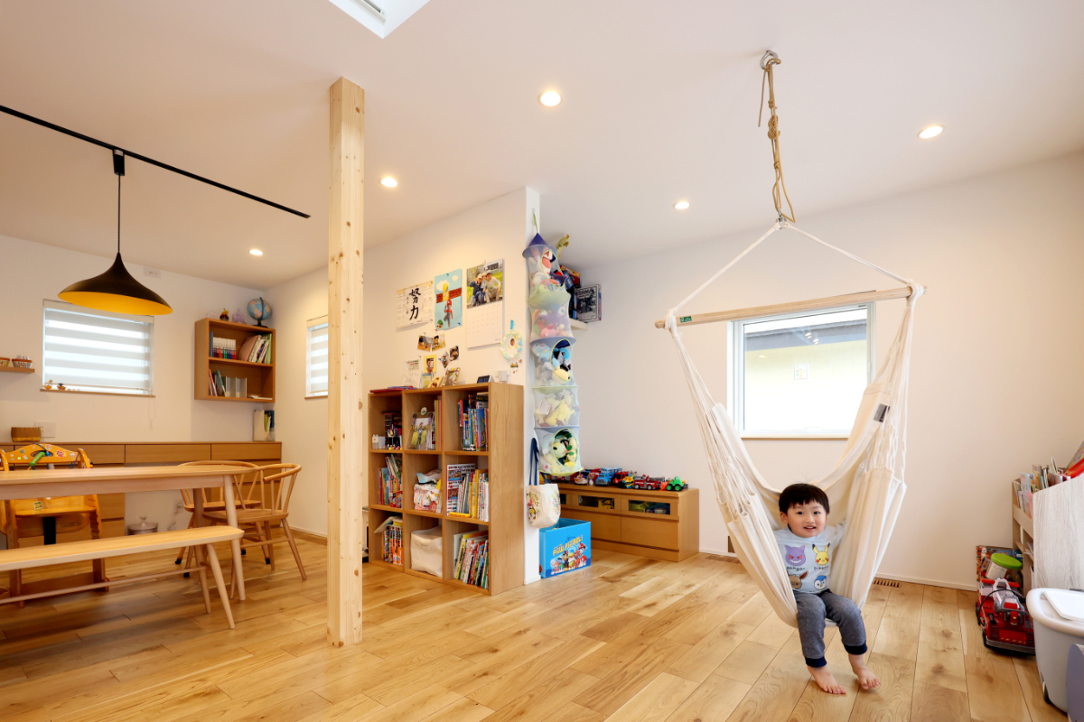 キッズスペースのハンモックは下のお子さんのお気に入りスポット。キッズスペースとダイニングを仕切る壁面はマグネット壁になっており、お子さんの絵や家族の写真などが飾れるようになっています。