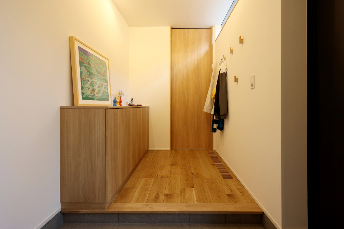 お客様から褒められることが多いという玄関。右手のコートフックは、奥さまのアイデアで下のお子さんが自分で上着をかけられるように上下2段に配置。