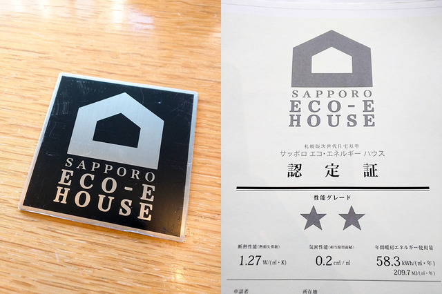 上の写真は、札幌版次世代基準の性能表示ラベルと認定証です。札幌市から認定を受けた際にもらったものだそうです。性能表示ラベルは金属製で、断熱の厚みをわかりやすくイメージ化しています。認定証は性能の良さを数値化し、☆マークで表示しています。気密性能の0.2cm2/m2という数字は、国が定めていた気密性能の基準よりも10倍も高性能です。