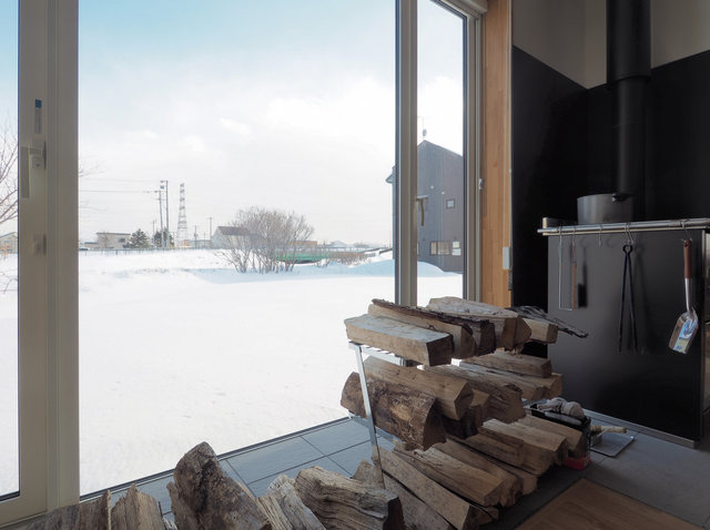 窓辺には薪が積み上げられています。薪山越しに外の景色が見えるように敢えてこの場所に薪置き場を作ったそうです。「晴れた日は2月でも日中は暖房が不要ですし、朝晩も補助暖房のエアコンだけで十分暖かいのですが、やはり部屋の中に火があると落ち着きますね(ご主人)」。