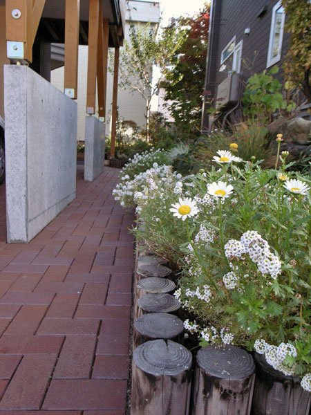 庭には弧状の建物に並行して作られた弧状の花畑が玄関アプローチから続く。庭づくりはご夫婦の楽しみでもあるようだ