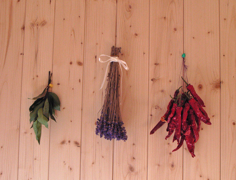 壁や玄関などのちょっとしたスペースには、奥様お手製のドライフラワーや木の実がセンスよく飾ってある。壁の一部には松材を使用。過ぎ行く時間で木の味わいも増す