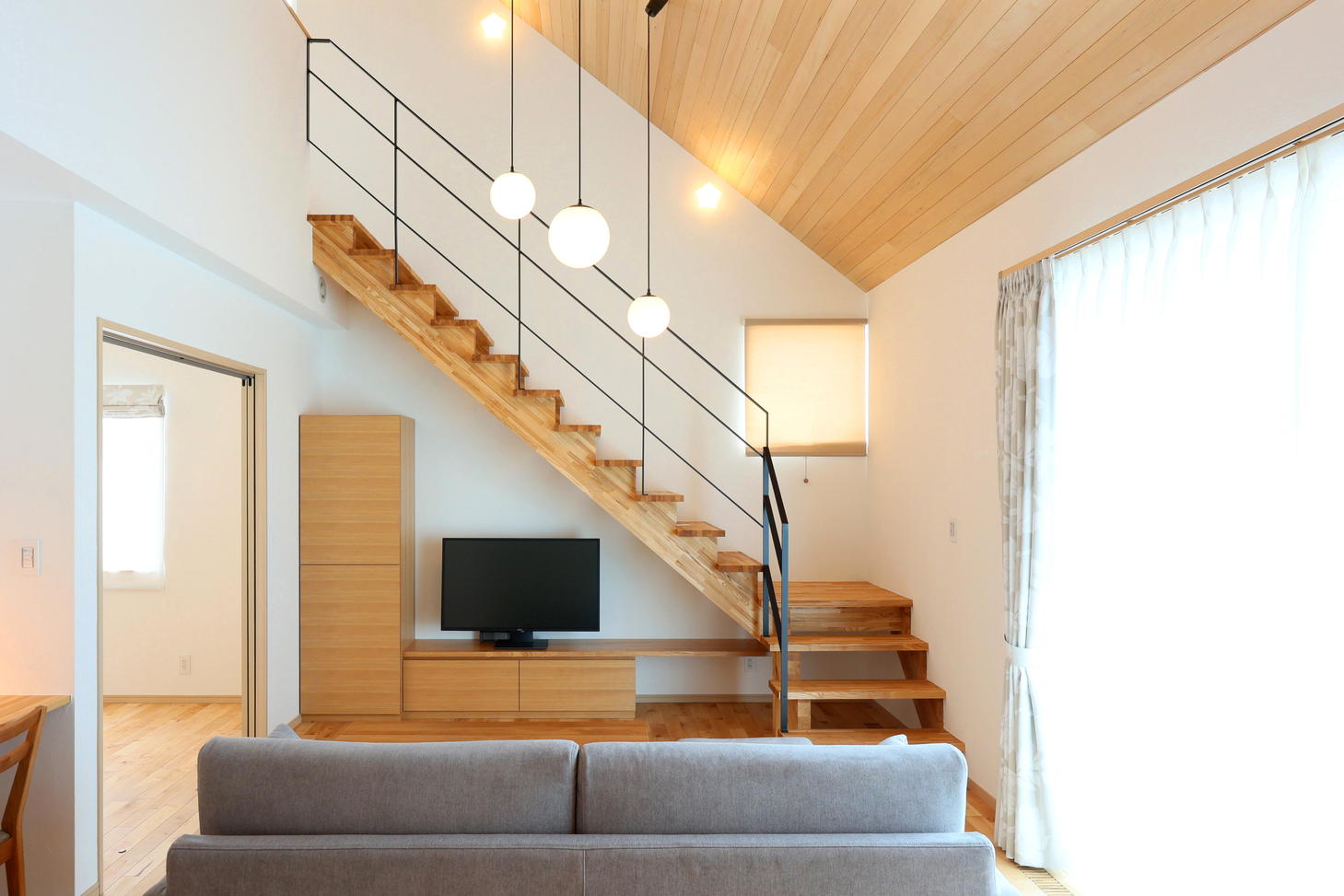太陽光発電を搭載した傾斜屋根を生かして、リビング・ダイニングと2階をつなぐ大きな吹き抜けが生まれました。