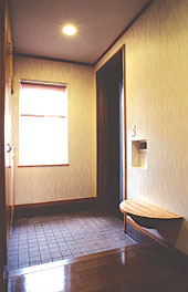 写真:広めの玄関には何かと便利な腰掛けも。角に足をぶつけたりしないよう、曲線で作る配慮をしてある。