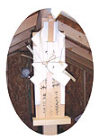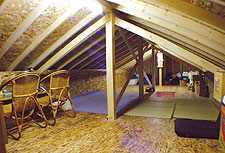 写真:小屋裏内部。感動の広さ。屋根で断熱されているのでここも部屋と同じく快適な温度。梁にはこんな奉りが。職人の息吹を感じる。