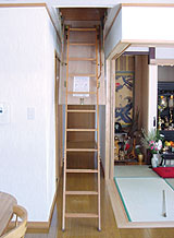 写真:この階段で小屋裏へ。階段は棒1本で簡単に出し入れできる。和室の引き戸は壁に収納できるので普段はリビングとつなげて開放的に。床の段差ももちろん無い。正面は納戸の引き戸。