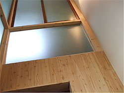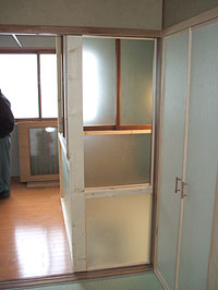 洋室にした一部に新しく吹き抜けを造りました。建具は既存の枠にフロストカーボを入れ替えて使いました。