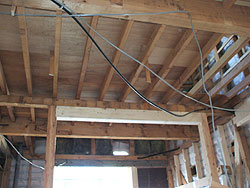 既設で柱・壁があった所をオープンにするため壁の撤去に伴い2階床の補強のため梁材を施工した部分です。