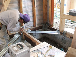 6.既設の柱と新しく入れた筋違の取り合い部分で、筋違プレート・ホールダウンコーナー金物の施工した部位がよくわかるところです。