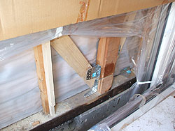 2階床組の横架材の継手部分が下がって床がたわんだ部分を下からマグサ(補強梁)を入れて修正した所です。
