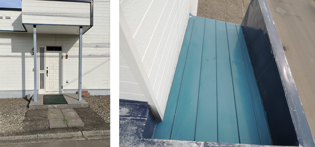 2つ目が雨・雪対策の工事。勝手口とトップライト(天窓)に雨水の進入を防ぐように改修したほか、落雪しないよう、玄関屋根をフラットにしています。